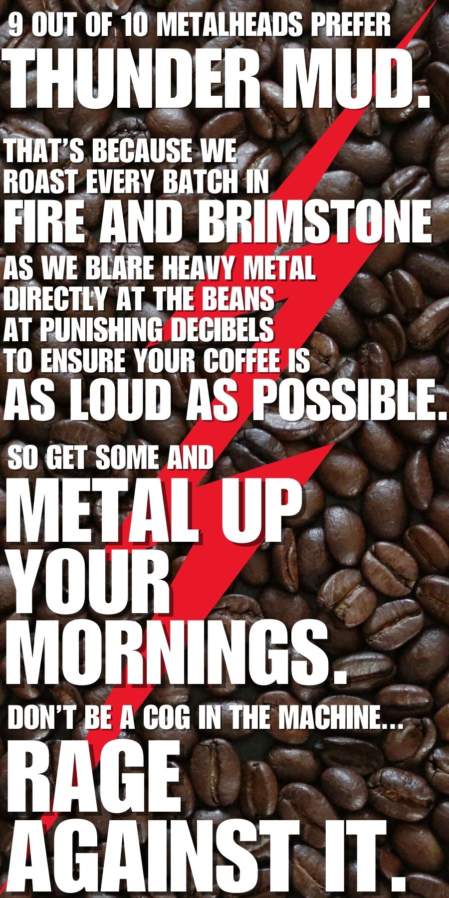 3) As each flavor is being painstakingly roasted, those beans are simultaneously locked away in pitch-black chambers where they are subjected to very specific, highly-curated, metal playlists. The music is specific to each blend; the songs blasted at the beans at a punishing volume that would decimate a normal human’s hearing in order to imprint on each batch the sonic fury to both draw out every nefarious note of flavor and to further separate the blend from every other option available to the surface world.